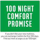 At Argos Home we want you to get the best night's sleep possible, so we offer a 100 night comfort promise on our mattresses. Try your new mattress for up to 100 nights and if you aren't sleeping soundly, we'll offer you an exchange for one that suits you better.